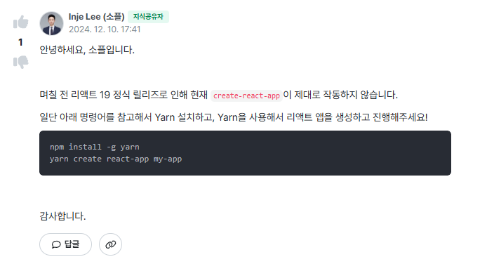React app 설치 시 문제 - 인프런 | 커뮤니티 질문&답변