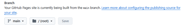 그 중 Branch 부분의 설정을 main / (root)로 변경한 후 저장을 누르면,