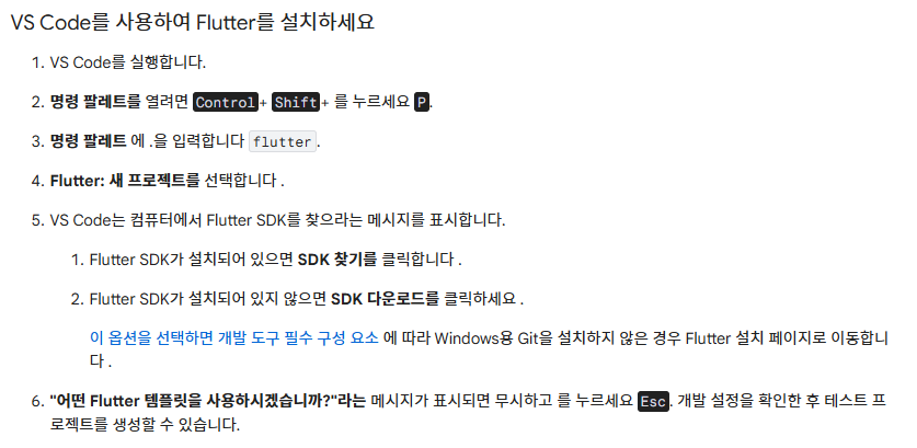 플러그인을 다운로드한 뒤에는 Control+Shift+P를 눌러 커멘드창에 flutter를 입력해 New Project를 고르면 SDK 폴더를 지정해주거나 다운로드 할 수 있다.