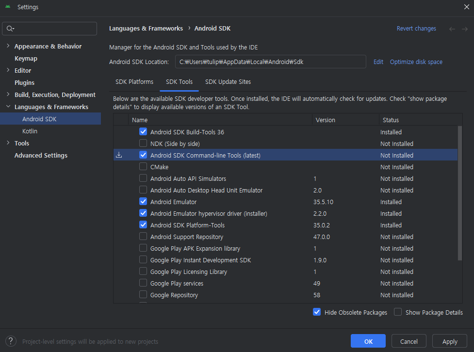 여기서 SDK tools에 들어가 부족한 툴을 선택해 다운로드 받아주면 된다.