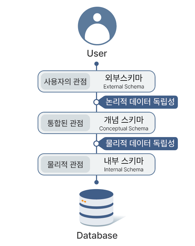 이렇게 분리하는 목적은 데이터베이스에 대한 사용자들의 관점과 데이터베이스가 실제로 표현되는 물리적인 방식을 분리하기 위함으로, 사용자는 데이터베이스의 내부 구조까지 알 필요 없이 필요한 데이터만 볼 수 있으면 되기 때문이다.