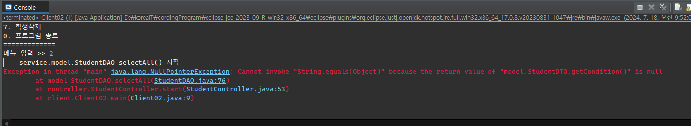 여기서 객체가 되는 stuDTO나 condition의 값에 문제가 있음을 알 수 있다.