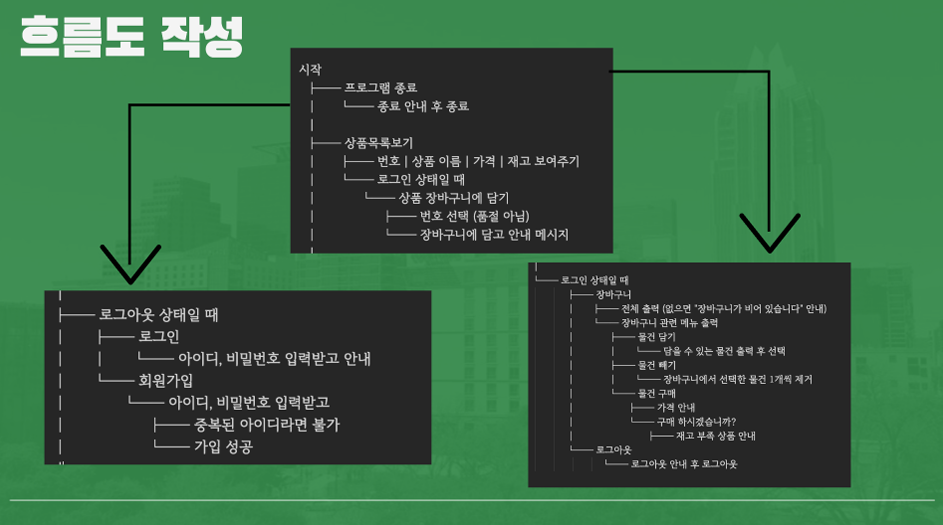 - C : 로그인확인 / 장바구니 비어있는지 확인 / 장바구니에서 입력받은 상품 삭제